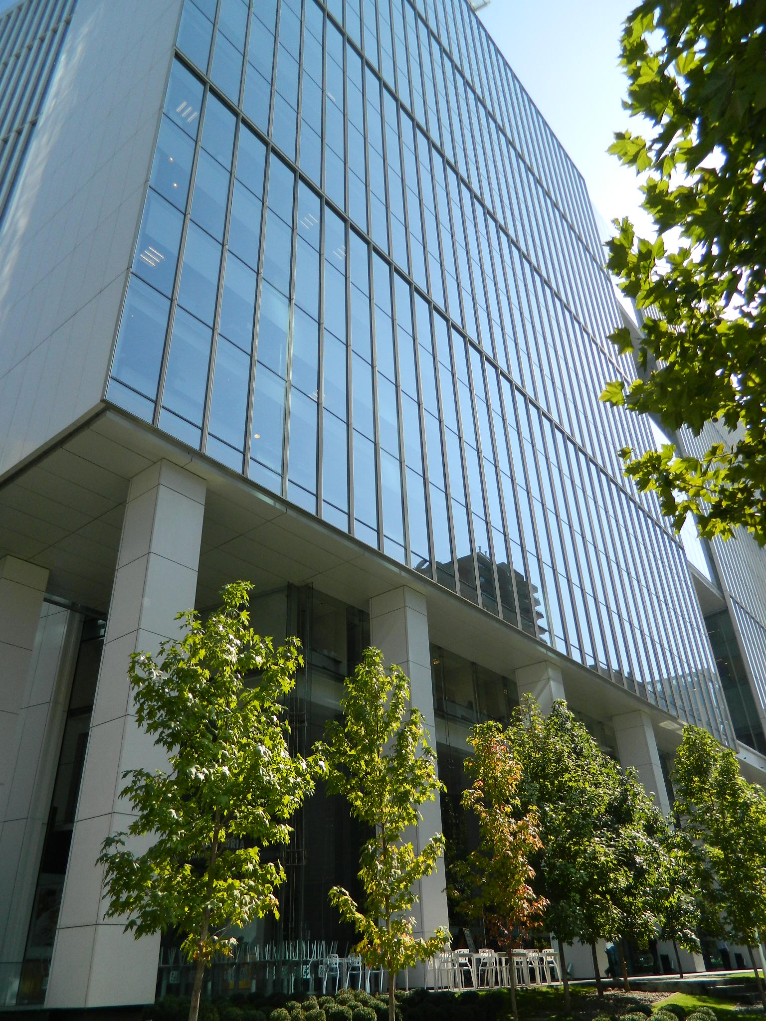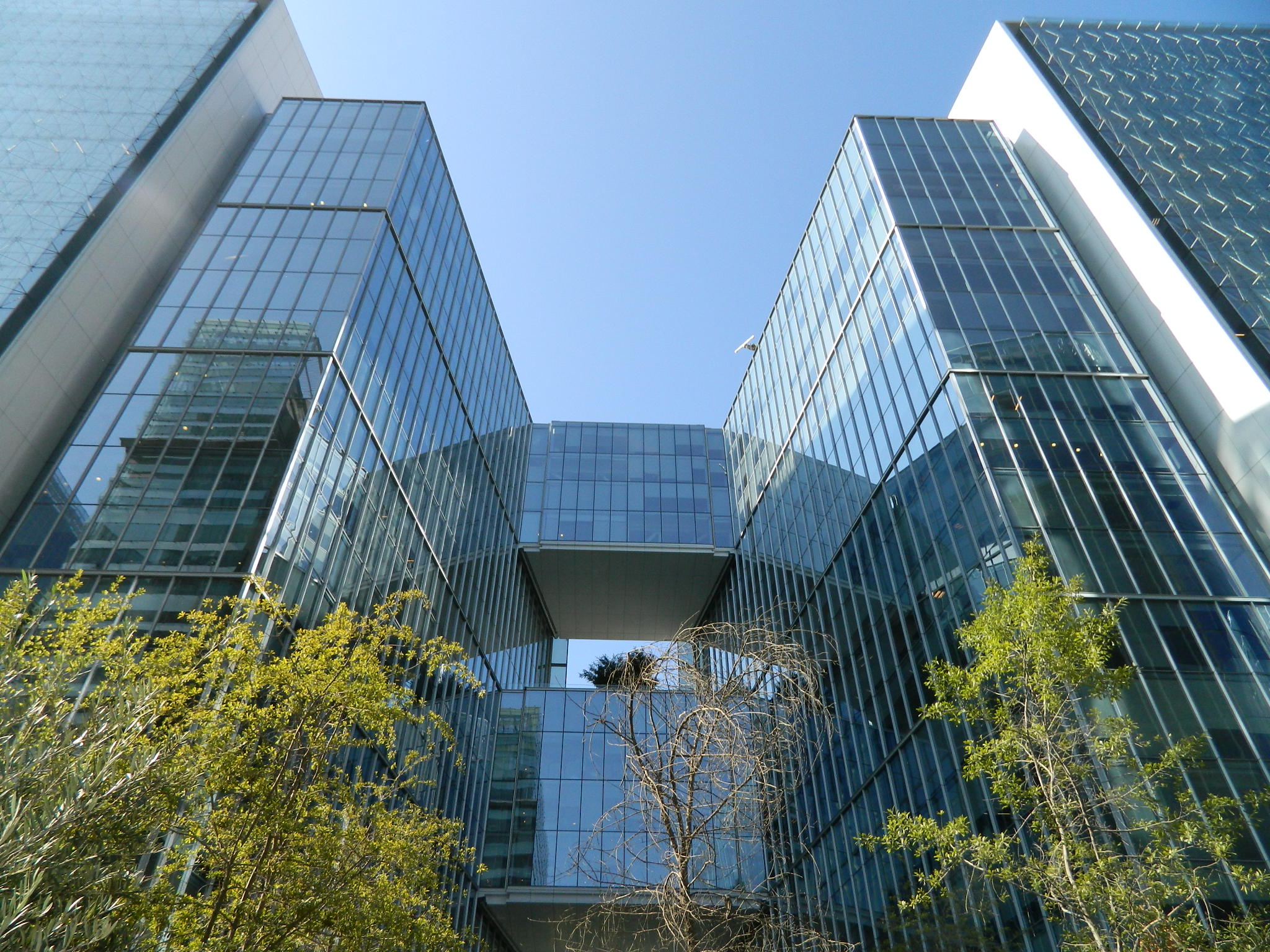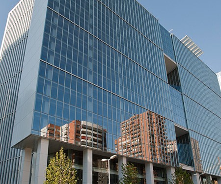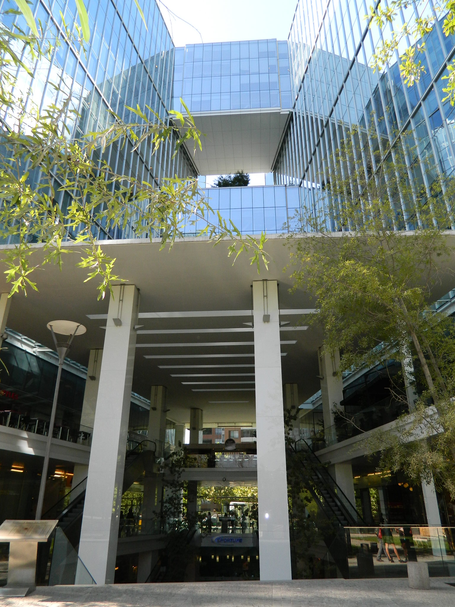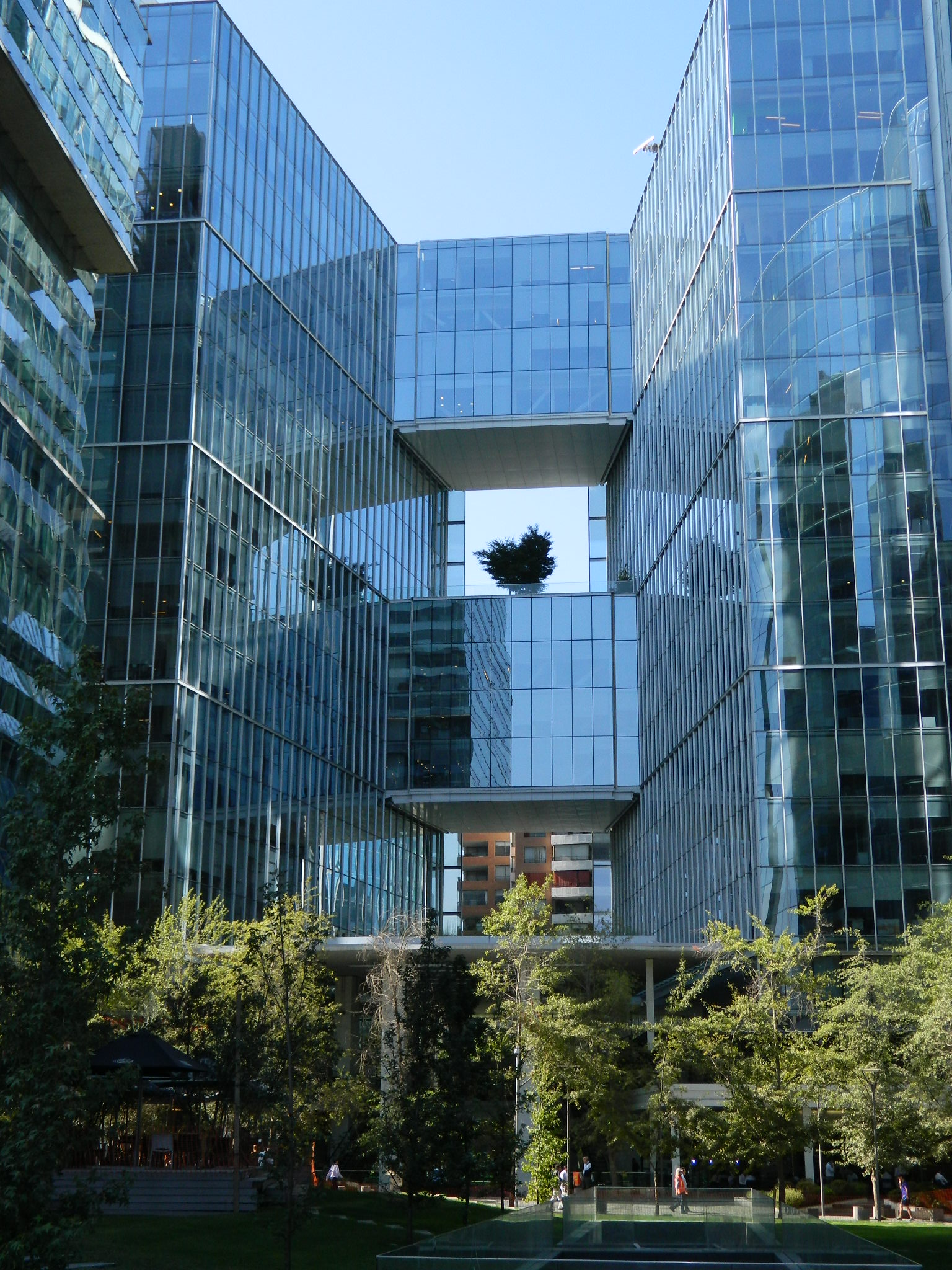 Its architectural design is developed symmetrically, with each building has a diamond shape, with walls that meet at the front street south to lead, and to the north open onto the boulevard that runs along the inside of the apple. Strategic location is a strategic sector in the urban road structure, since there major cross roads and inter-communal connection such as Amerigo Vespucci beltway and Manquehue Avenue North, crossing the avenues Vitacura, Kennedy, President Riesco and Apoquindo, also include Alonso de Cordova Avenue crossing diagonally, and in a larger radius (approx. 1.6 km) is Santa María Avenue Costanera Norte. The latter corresponds to one of the high-speed concessioned highways that connect from the east of the city to the airport and motorways heading north, south and west of the capital. Notably is operating Manquehue Metro Station at the junction of North Street Apoquindo Rosario.